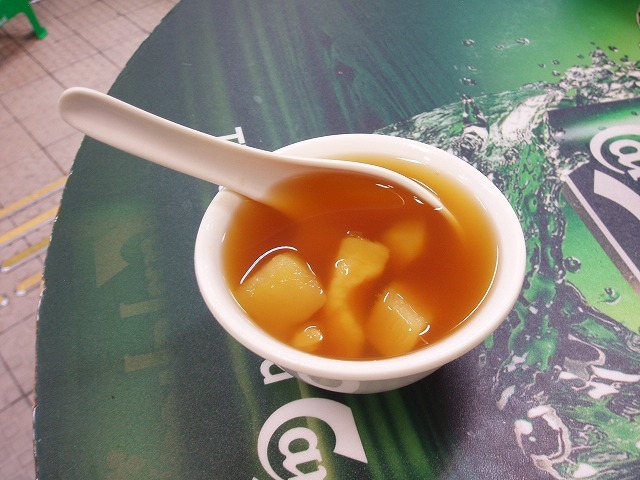 お料理を食べ終わって一息ついていると、サービスのデザートが来ました。さつまいもの生姜煮です。生姜の辛みと甘いスープがベストマッチ、風邪で痛めたのどに効きそうなデザートでした。