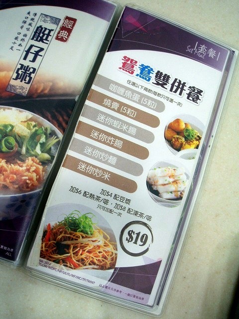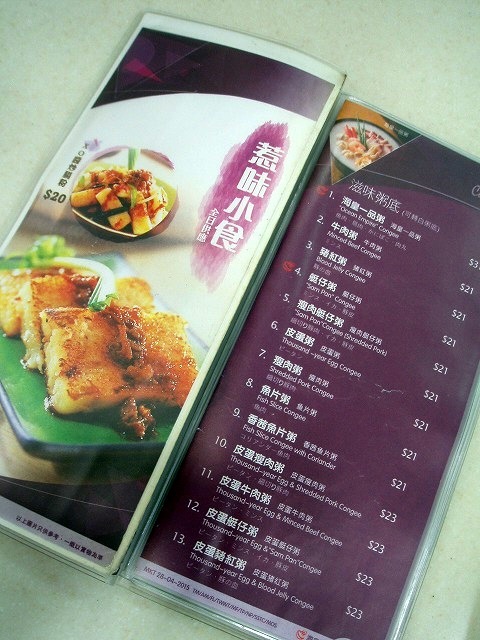 テーブルの上には、各種調味料やお箸がセットされています。テプラで名前が貼ってあるなど、香港らしくない雰囲気(笑)日本の牛丼屋さんに来ているような錯覚に陥りました。メニューをみて、何を食べるか思案。お粥メニューだけでも20種類以上あります。焼売や腸粉などのセットメニューもあります。ここでも「鴛鴦」の表示を見つけて、面白いなあと思いました。2種類のお料理が少しずつ食べられるセットメニューもよさそう。夫婦それぞれ別のメニューを注文しました。