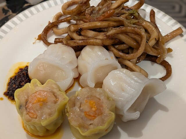 私は朝食の時間帯に訪れたので、サラダや玉子料理を中心に楽しみました。味は、まあ、一般的なビジネスクラスラウンジのクオリティといったところです。点心は恐らく冷凍食品ではあるのですが、エビや豚肉がギッチギチに詰まっており、成城石井の総菜に比肩するレベルです。これらをツマミに朝からシャンパーニュが進むのなんのって。