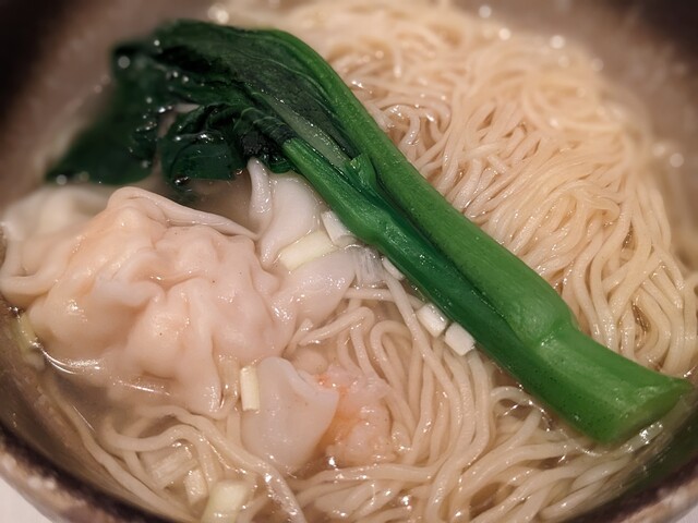 〆に定番のワンタン麺。ワンタンには海老がたっぷりと詰まっており文句なしの旨さ。麺の方向性については既に述べた。ちなみに麺類の仕様はお隣のビジネスクラスラウンジのそれと同じに感じました。