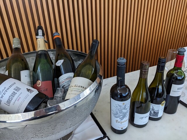 入ってすぐの空間。窓付きの東京ドームのようにドーンと開けた空間が印象的。一方で、あまりに広く明るすぎるため、高級感はそれほどありません。さっそく「シャンパンバー」に立ち寄り駆け付け1杯。シャンパンバーという割に2種類しか置いてへんやんけ、と毒づくのですが、そのうちのひとつがドラピエのミレジム・エクセプションであり、ほほう、やりおる、と感心します。現金なものです。