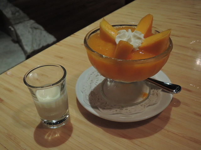 ほどなく食べ進んで練乳をかけて、味の変化を楽しむ。