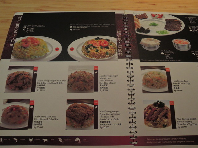 メニューは写真と日本語でも書かれているのでわかりやすい。食材はイラストで示されており、ポークは使われていない。