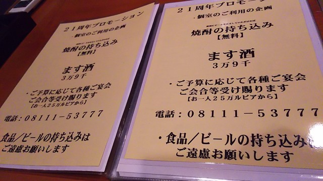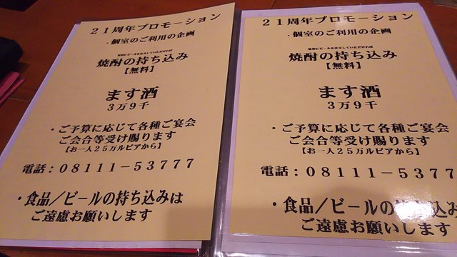 1709_Marufuku-丸福-_メニュー(21周年プロモーション焼酎持ち込み無料サービス)