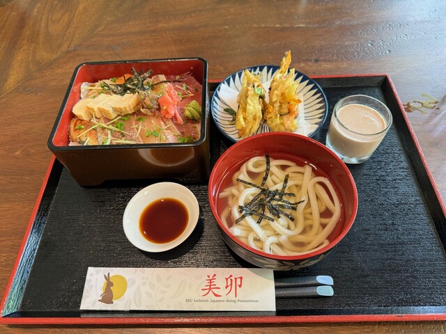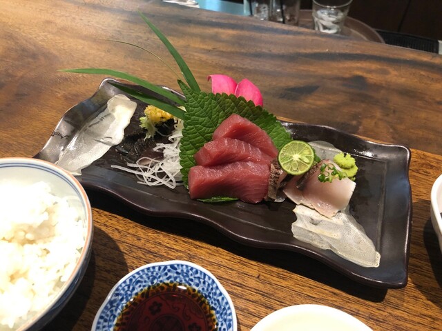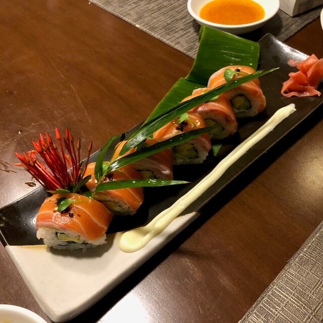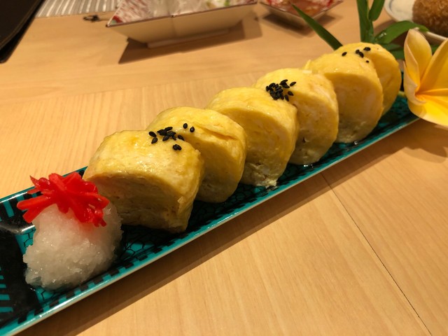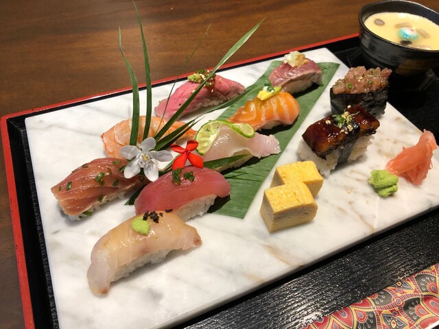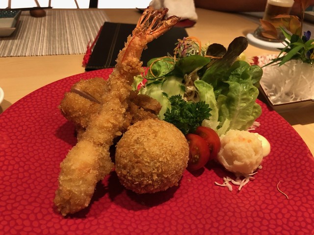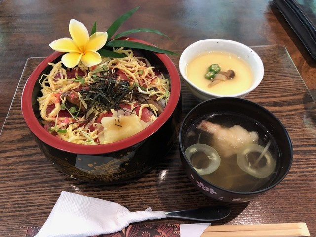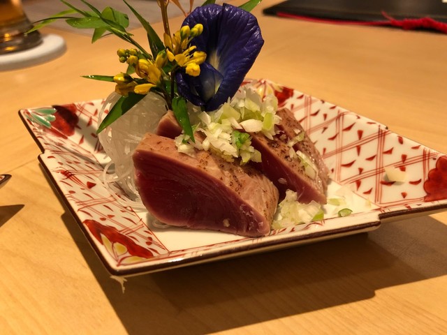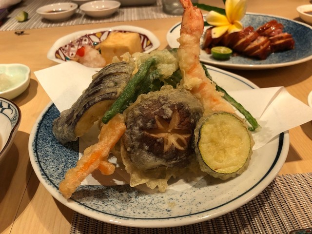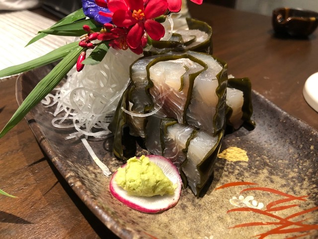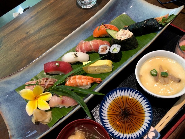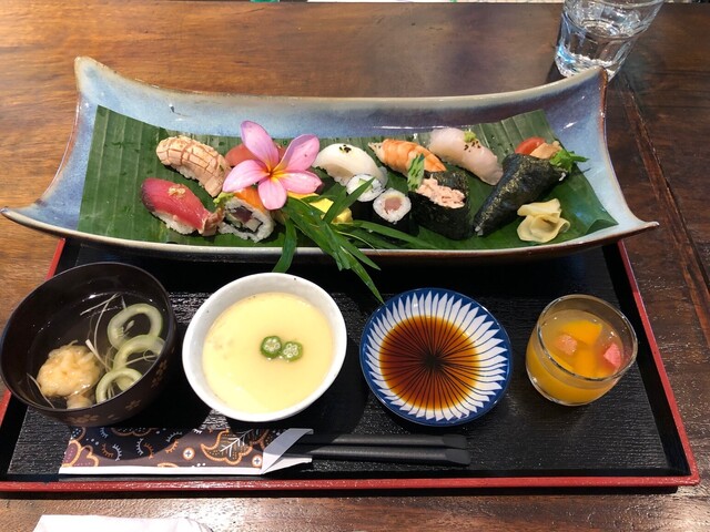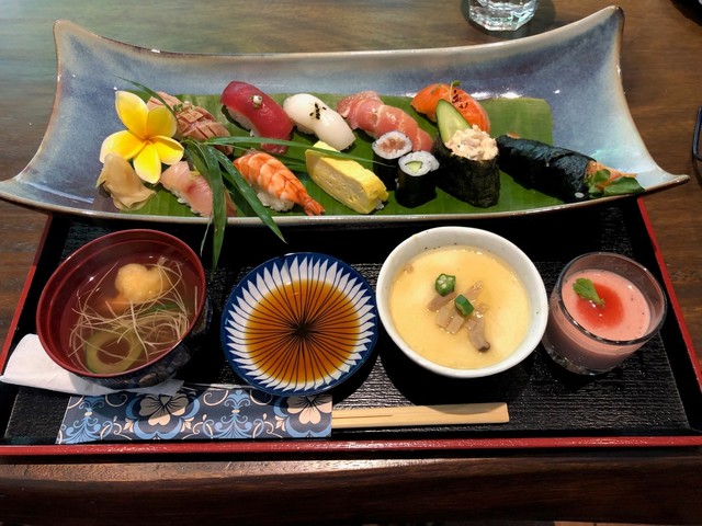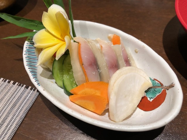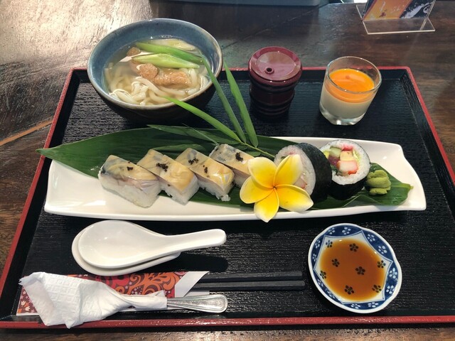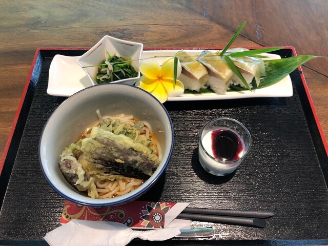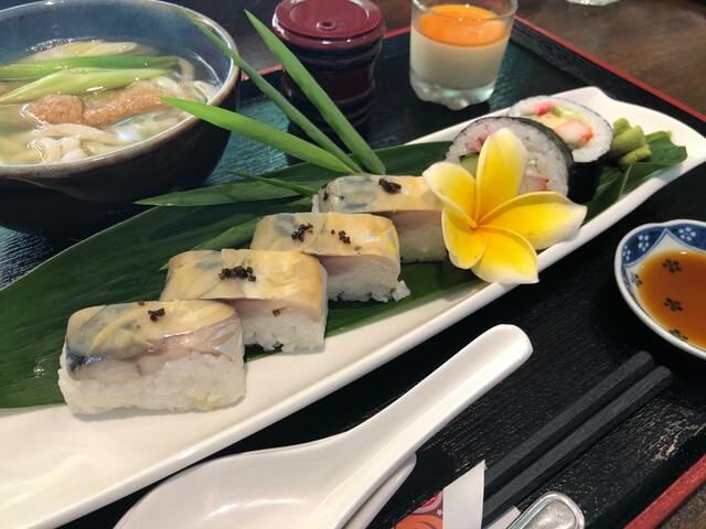 新メニューの鯛の混布締めの棒寿司と天ぷらのセットを注文しました~。