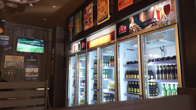 1810_JR's Barbecue_店内(お店中央にはたくさんな種類のビールが入った冷蔵庫が鎮座)