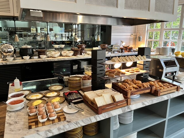このホテルは前の常宿プルマンと比べやや郊外ですが、歩いてモールにも行けるし私は気に入っています。朝食会場はプルマンの異常な広さと数との比較不能も、和・洋・尼のバランスがとれたビュッフェ形式。長期滞在にも向いています
