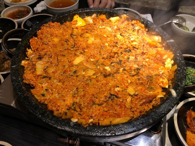 ホルモンの後はそのままの鉄板でキムチチャーハン!。