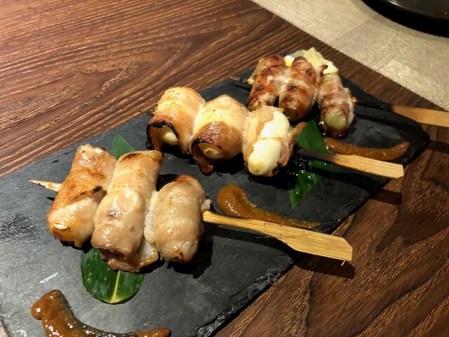 豚バラの串はチーズと鶉の玉子とアスパラ!。