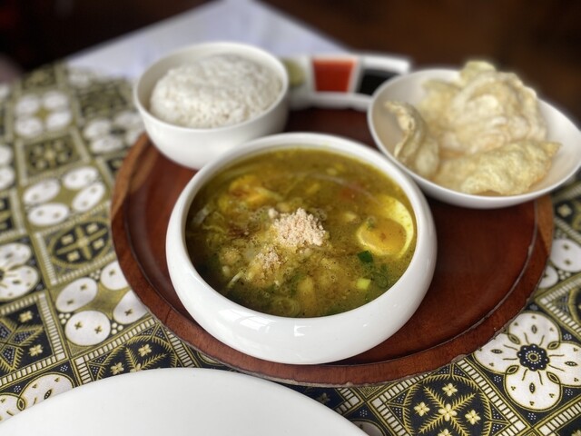 ソトアヤム(インドネシア風鶏スープ)は、ターメリックの風味が効いた黄金色のスープ。あっさりしていながらも鶏の旨みが凝縮されていて、飲むとじんわりと体に染み渡る。添えられたライムを絞ると、爽やかさが加わってさらに美味しい。春雨やキャベツが入っていて、食べ応えも十分。