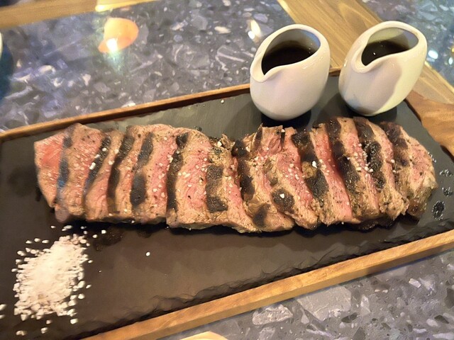 この日のハイライト。柔らかくジューシーなステーキはボリュームも十分。私は塩でお肉の味を楽しんだ