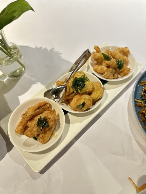①三種のフリット(カボチャ・きゅうり・シメジ)カレーリーフ776円