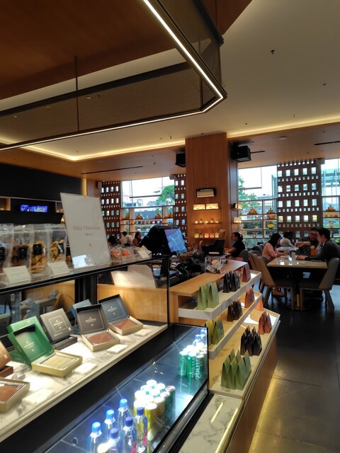 ショーケースに並ぶ1粒チョコレート、チョコレートケーキは綺麗だが、持ち帰りを考慮し板チョコを。