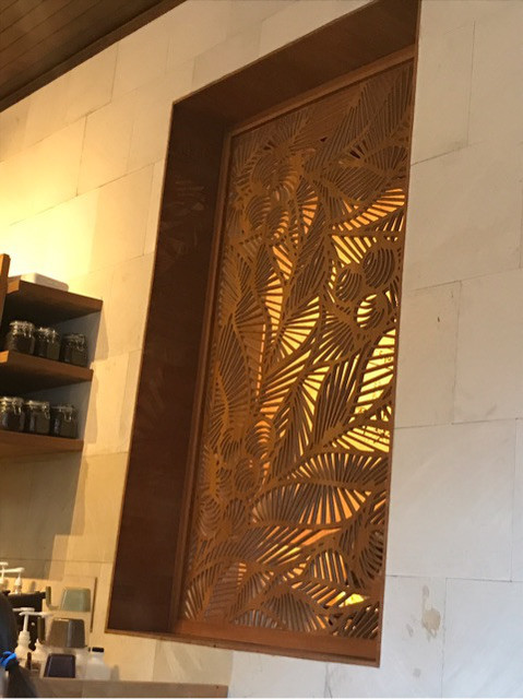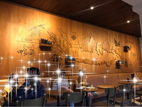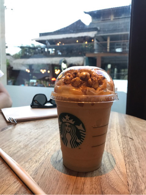 こんなロケーションにあるなんて!世界で2番目のロケーションと評判なのですって!それも納得です。ハスの花がいくつか咲いていましたよ。寺院からはスターバックスの看板な見えない配慮も。 正面入口。 賑やかな繁華街から奥に入ると…こんな景色があるなんて!大人気でしたよ。 店内も天井が高くて広々として。 壁の装飾もバリらしく。 ポップコーンがトッピングされたフラペチーノ バリらしいインテリアも素敵でしたよ!! 良い思い出になりました。ごちそうさまでした。