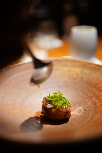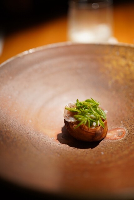 → 根菜や発芽した根の食材で構成。土の香りと滋味を感じさせる一皿。