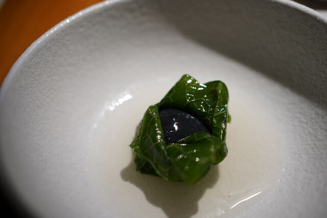 → 黒ゴマ団子を鴨出汁で。強烈な香りのペタイ豆(stinky beans)でパンチを加える。