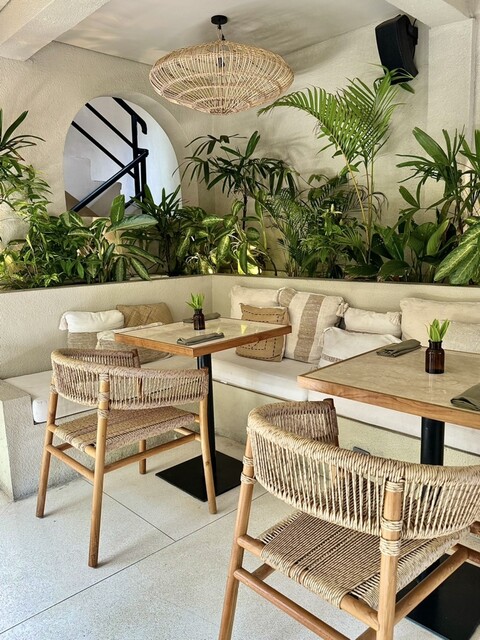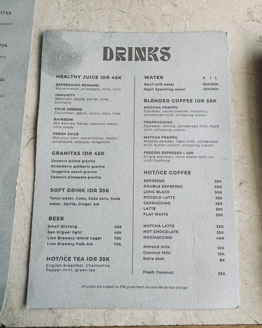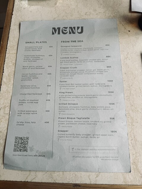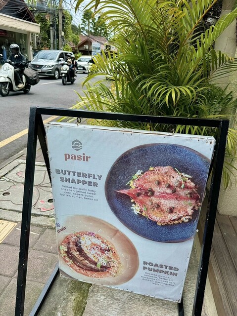 2階も含めてかなり席数がある。客層は欧米人の旅行者風の方が多かった。地中海系とバリの料理を融合させるというテーマらしくシーフードを使ったメニューが多い。店名のPasirはインドネシア語の“砂”で、内装は海岸をイメージしたそう。ベージュと白に植物の緑で落ち着いた雰囲気。