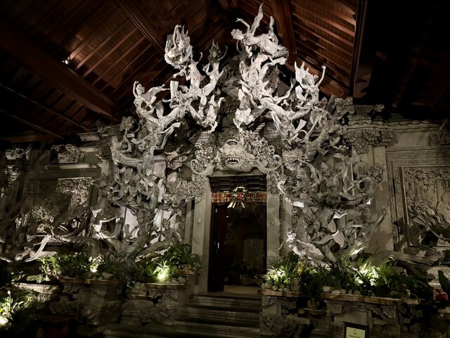 ファサードからインパクト大のレストランは入店するとさらに凄いことになっている。昼も夜もフォトスポットになっている神々の巨大像がレストランの庭にある。店内の造作もこだわりが効いている。