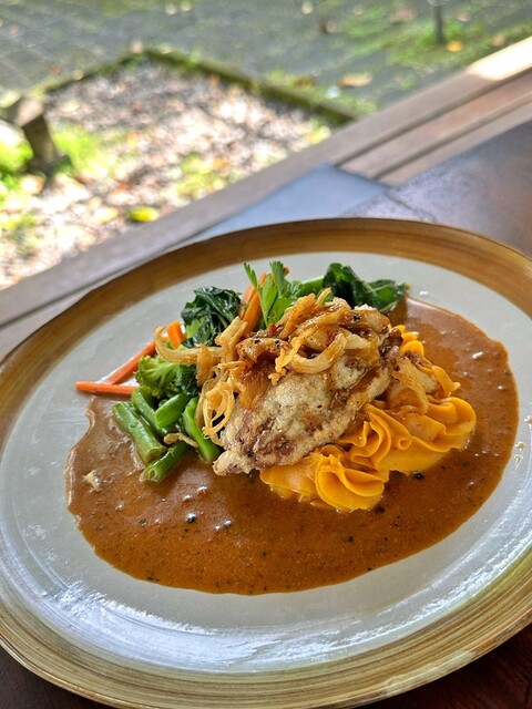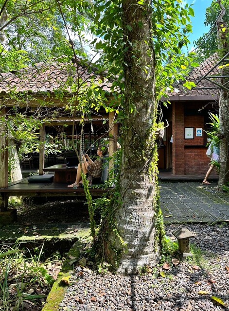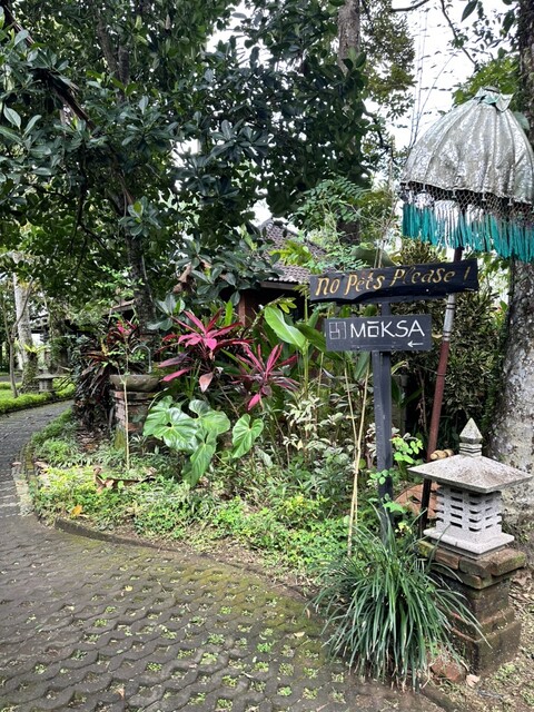 日本の田舎を思わせる、長閑な田んぼに囲まれた小さな山のふもとに、「MOKSA」の看板を見つけ、店の近くに車を停めた。里山の一部を切り開いて造られたそのお店は、木々が生い茂り、レストランというよりもまるでリトリート施設のような佇まい(実際、レストラン以外に施設内にはヨガのスタジオも併設されている)。厨房に隣接したテーブル席もあるが、敷地内にはバリ独特の屋根付きで開放感のある「バレ」(日本でいう東屋のようなもの)が点在しており、自然の中でゆったりと食事が楽しめる。