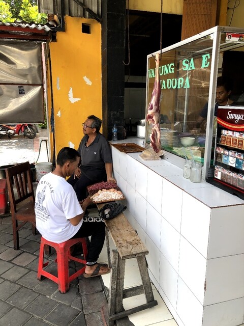 香ばしい煙に誘われて辿り着くと同時に、阿吽の呼吸で「サテ・カンビン」と、スパイスの芳香溢れるスープ「グライ」と、ライスが供される。