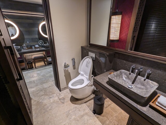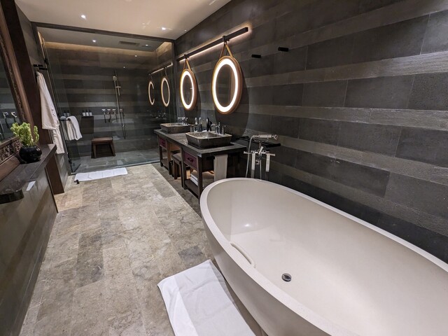 ウェットエリアはその辺の大学生の独り暮らしの部屋よりも広いかもしれません。いったい何リットル入るんだという容積のバスタブが象徴的で、立派なバスボムが用意されているのも嬉しい。