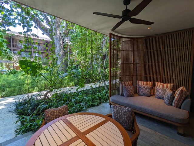 テラスも広々としておりデイベッドは成人が大の字で寝転がることができるほどのサイズ感です。1階で通路とプールに面しているため時おり人が通りかかるのが気になるものの、地面とシームレスに繋がっているため余計に広さを感じることができるとも言えます。