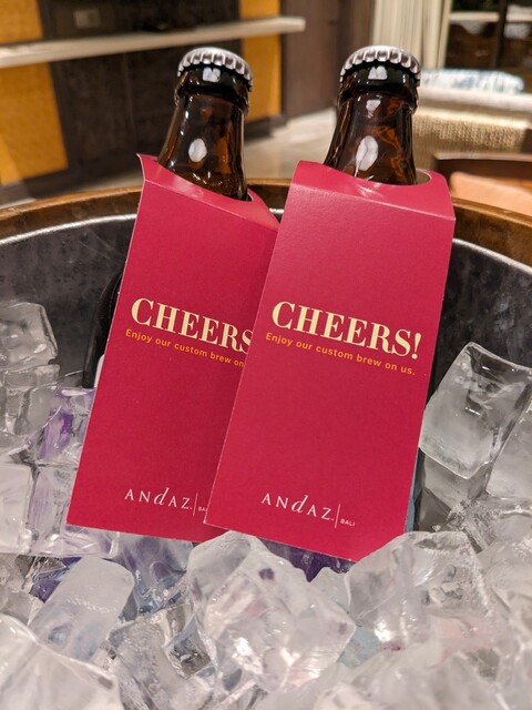 そうこうしているうちにウェルカムビールが届きました。アンダーズの名を冠した地元のクラフトビールであり、長旅の末に辿り着いた五臓六腑に良く沁みます。ちなみにスパークリングワインで無いのは、インドネシアは舶来品のアルコールの関税がバリ高いので、とても出せやしないのでしょう。