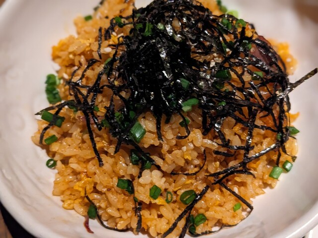他方、キムチチャーハンは悪くはないのですが平凡な味わいです。そこで序盤のカニのタレをぶっかけると途端に美味しくなり、アンダーズバリ七不思議のうちのひとつかもしれません。