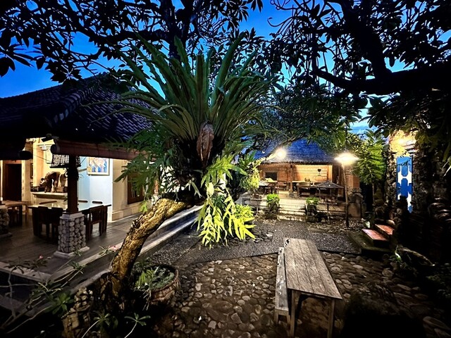 この店主のイダさん、只者ではない。彼はこの店のオーナーでもありながら、店内に数多く置かれた彫刻作品を作るアーティストでもある。バリの伝統的な家屋と広い庭をリフォームし、家庭的でありながらヒンドゥー寺院のような神秘的な空気が漂う、唯一無二の空間を作り上げた。