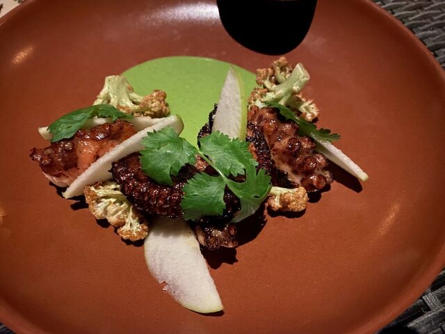 4皿目はBBQOctopusです。カリフラワーがカリカリで美味しいです。奥にあるソースは「AsianGazpacho」だそうで、ココナッツの風味がするソースです。ソースをつけない方が美味しいかな。