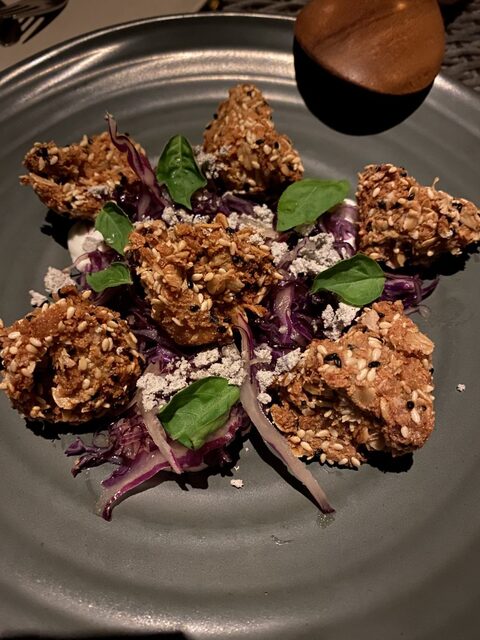5皿目はCrispyFriedChickenです。これはから揚げですね、普通に美味しい。店員がドヤ顔で「こちらは日本のから揚げからインスピレーションを受けた1皿です」的なこと言ってました。インスピレーションも何も、まんまから揚げです。こういうゴマが付いた冷食のから揚げあった気がする。草。