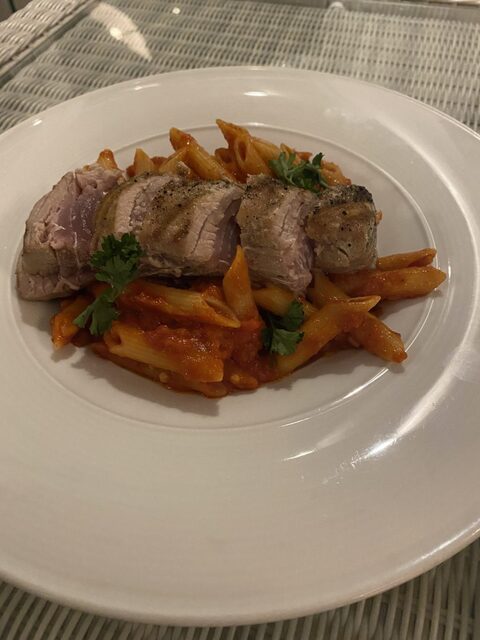 注文してから1時間15分経過、漸く到着です。TunaPenneの名の通り、ペンネ・アラビアータの上に炙った鮪のタタキが乗っています。ペンネと鮪の組み合わせが良いのかはさて置き、どちらも単体で食べると中々美味しい。不味かったならば怒りを爆発させることが出来たのに、残念?ながらそこそこ美味しく、怒りが少し治まりました。