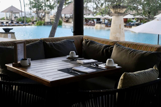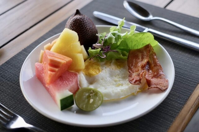 バリの朝はちょっぴり遅め。6:30を過ぎた頃からだんだん明るくなってきます。移動疲れの抜けない1日目の朝はゆっくり起きてのそのそと朝食を食べに。滞在中は「SUKU」というレストランでビュッフェがいただけました。(今回はお願いしませんでしたが、メニュー表から日本食やエッグベネディクトなどのメニューを選ぶことも可能です)