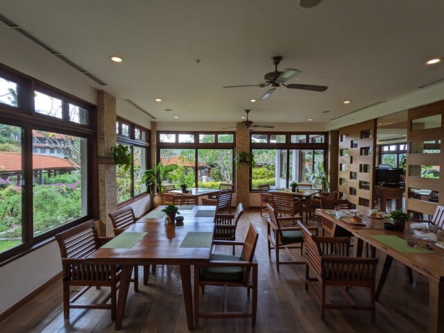 「GrandHyattBali(グランドハイアットバリ)」のエントランスロビー脇にあるレストラン「GardenCafé」。朝から晩まで稼働を続けるオールデイダイニングであり、我々は朝食で利用しました。