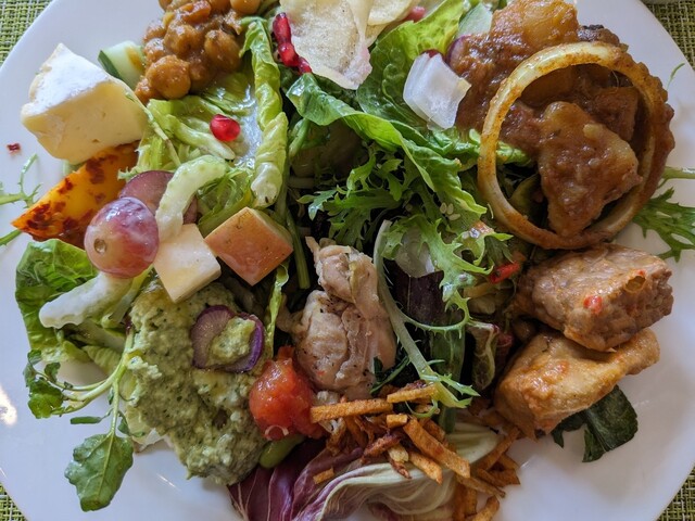 食事のラインナップも一般的なものであり、サラダにチーズ、ハム、ソーセージ、フルーツ。そのほかアジアっぽい料理もいくつか用意されており、とりとめのないラインナップです。