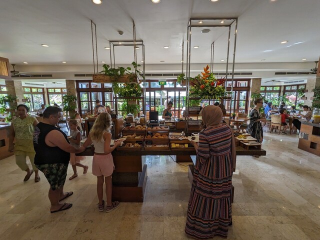 「GrandHyattBali(グランドハイアットバリ)」のエントランスロビー脇にあるレストラン「GardenCafé」。朝から晩まで稼働を続けるオールデイダイニングであり、我々は朝食で利用しました。...