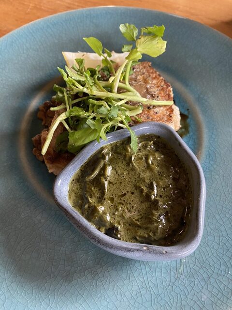 BarramundiFillet、皮目がパリッパリに焼かれており、身も厚くて美味しい。バラマンディとはスズキ目アカメ科の大形魚で、東南アジアやオーストラリアで食用にされている魚だそうです。手前はほうれん草をクリームで煮たものですが、これは美味しくない。