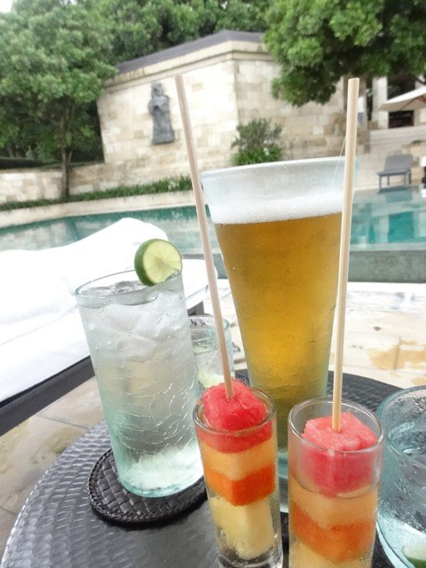 スタッフがウェルカムドリンク&フルーツを持ってすっ飛んで来てくれ、デッキチェアに何重もタオルを...