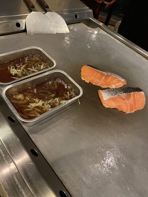 炒めたネギは醤油ベースのタレに入れ、煮立たせます。その横でサーモンをグリルして