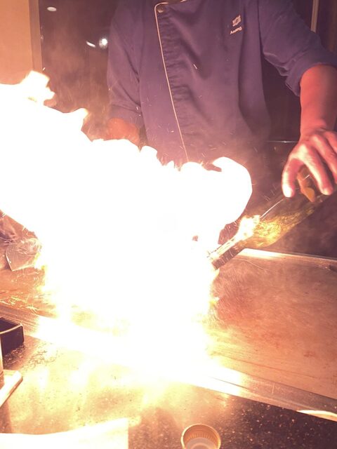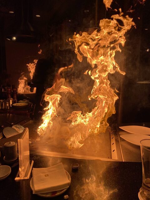 明らかに火が過剰であり、滅茶苦茶熱い。暑いじゃなくて熱いです、一歩間違ったら火傷するレベル。USJのバックドラフトより熱いです。シェフはニッコニコでした。守りたい、この笑顔。