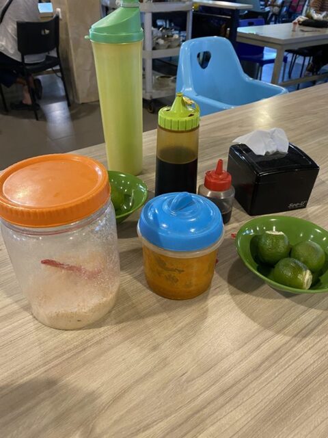 テーブルにはケチャップアシン(インドネシアの醤油)、ケチャップマニス(甘い醤油)、サンバル、ライムが置いてあります。左の謎の粉は海老煎の粉的なものらしく、お好みでスープに入れるそうです。
