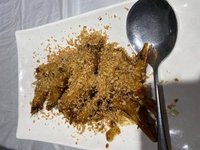 う~んイメージと違う・・・1オーダーでエビが8匹も入るのは嬉しいのですが、肝心の味が好みではありません。甘辛ソースに揚げニンニクがたっぷりとかかっているのですが、ソースは甘みが強く且つ味が濃い。超テン下げ。