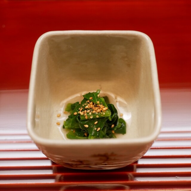 希少な国産の金胡麻を使用した「ほうれん草ごまあえ」は、香り高い胡麻がほうれん草を引き立てています。