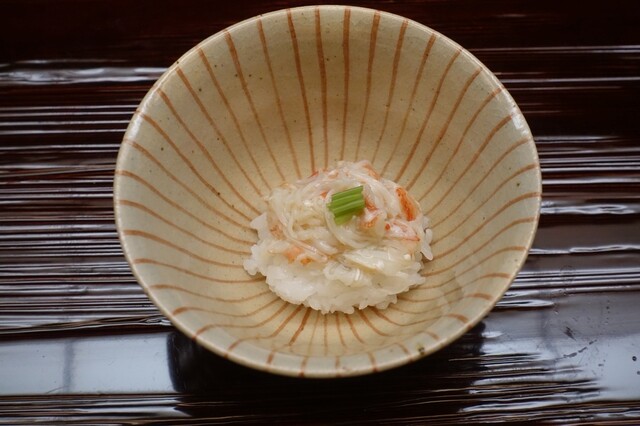 温物では「蕪と海老の錦秋蒸し」が印象的。六角形に切り出した蕪の上に、ふわりとした海老をあしらった一品で、立ち上る湯気の段階からもう香りが良い。口に含むと蕪の甘みと海老のうま味が層になって広がり、食感と香りの両面から季節を感じさせる仕上がりになっている。