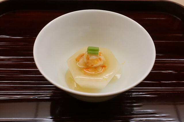 料理の始まりは「能登椎茸と能登の湧水のお香煎」。椀ではなく、まず、飲む出汁で森の香りを立ち上げてくるあたりがこの店らしいアプローチだ。澄んだ湧水に能登椎茸のうま味が静かに溶け込み、口の中が一気に北陸モードへと切り替わる。そのあとに続く「銀杏餅の白味噌仕立て」は、とろりとした白味噌の甘みの中に、銀杏餅のもっちりとした弾力が潜み、香りと食感で秋を描き出す一椀。出汁を軸に季節を重ねていく構成に、京都と片折で学んだ技の積み重ねが見える。