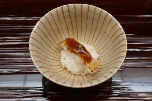 蟹仕事は、片折譲りの看板パート。まず届けられるのは「加能蟹の蒸し寿司」。ふわりと立ち上る湯気の中に、蟹味噌の濃厚な香りと金沢の芹の青みが溶け込み、蒸し寿司ならではのやさしい温度帯が蟹の甘みを自然と押し上げる。そして「香箱蟹」。甲羅に内子と外子を惜しげもなく詰め込み、土佐酢のクリアな酸味で味を整えることで、複雑な旨味をきれいに立ち上げ、後味はすっと軽く収まる。