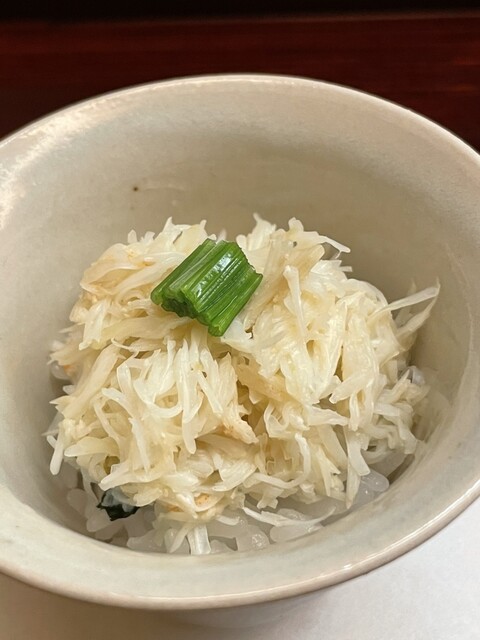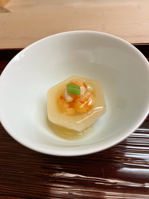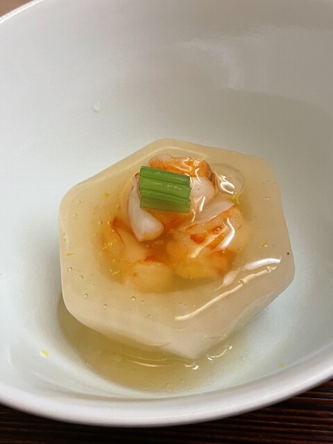銀餡の瀞みと共に頂く蟹の解し身から甘味が