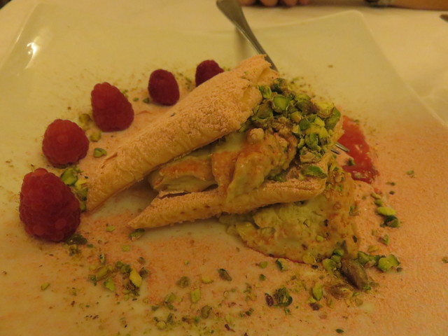 デザートは3つから選ぶようになっていて、ミルフィーユにしてみました。ラズベリーソースとピスタッキオのクリーム、きな粉のような味のパウダーが降りかかっていて、見ため通りの美味しさ。完璧です。