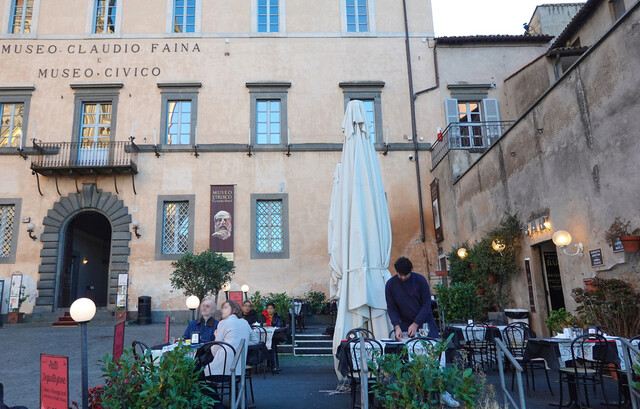 前のカフェでオルヴィエート・クラッシコ(€9)とホット・チョコレ