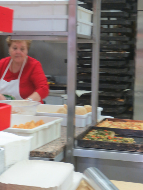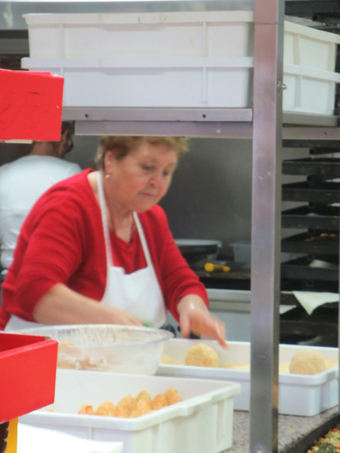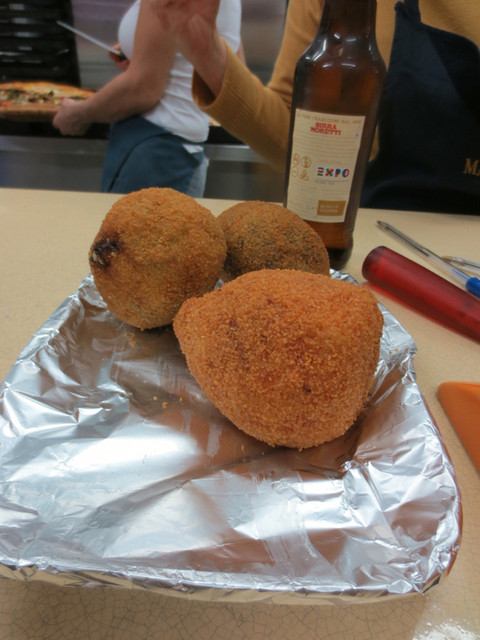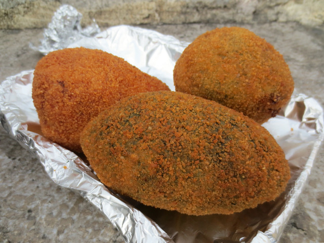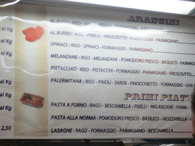 さて、2メートルくらいの長い行列ができていますが、なかなか進みません。油断すると抜かれてしまったりするので、注意が必要です。やっとたどり着き、ほうれん草、ミートソース、パレルモ風のアランチーニ3つを注文。